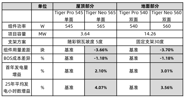2、对比采用传统P型组件的项目方案,采用N型Tiger Neo组件25年全生命周期总发电量可达约56839.6万度,对比发电量增益达3.66%。