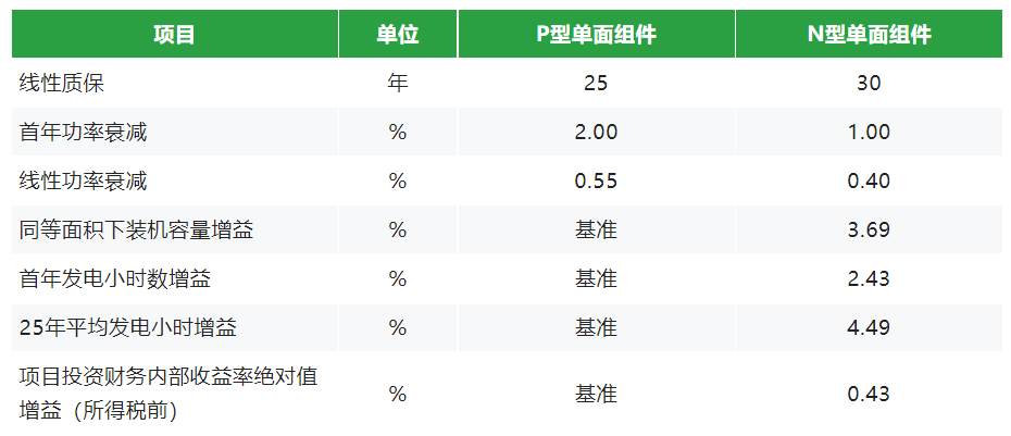 4、综合考虑电站全生命周期内N型多发电4.49%,采用N型组件项目投资财务内部收益率(所得税前)较采用P型高0.43%,此项收益折算单瓦EPC成本下降0.28元。